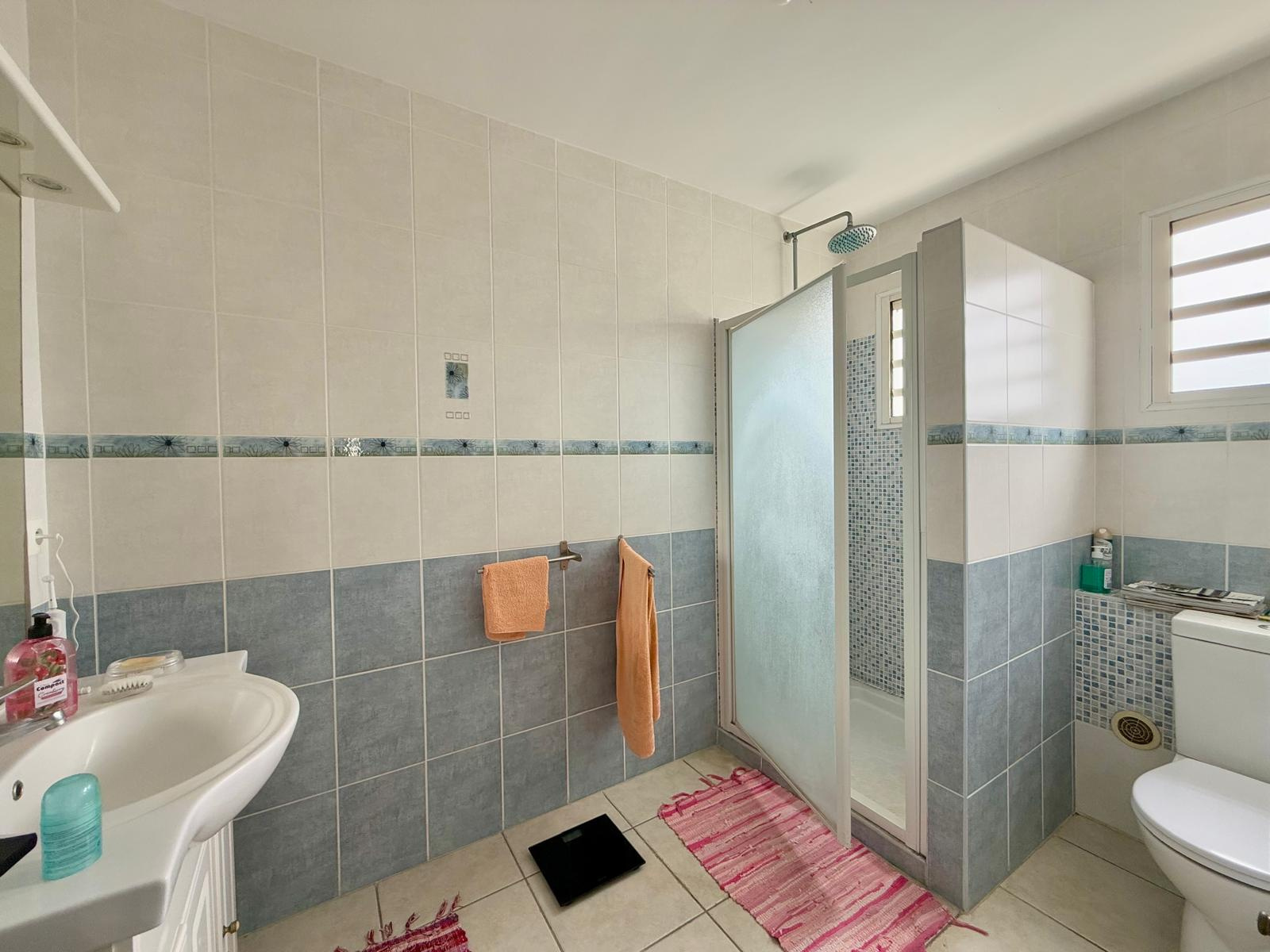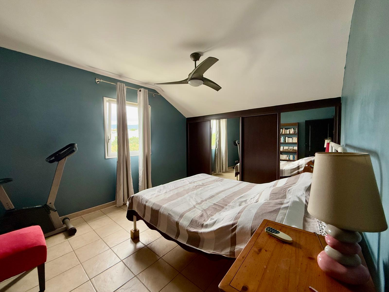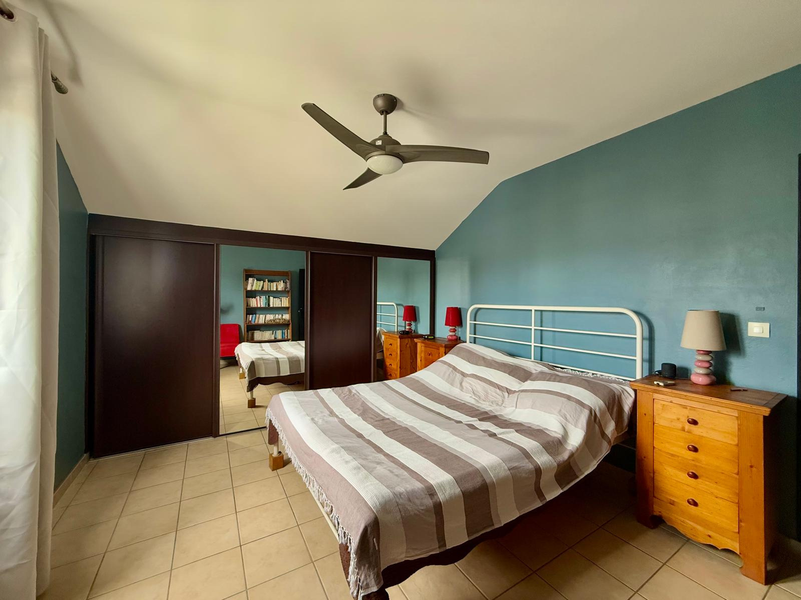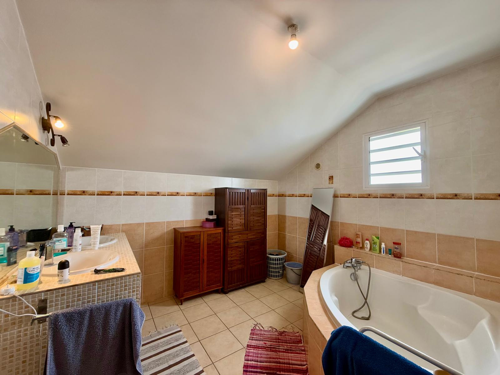 À l’étage : 3 chambres confortables, toutes équipées de ventilateurs plafonnier et placards intégrés. Salle de bain avec baignoire d’angle et double vasques, WC séparés.